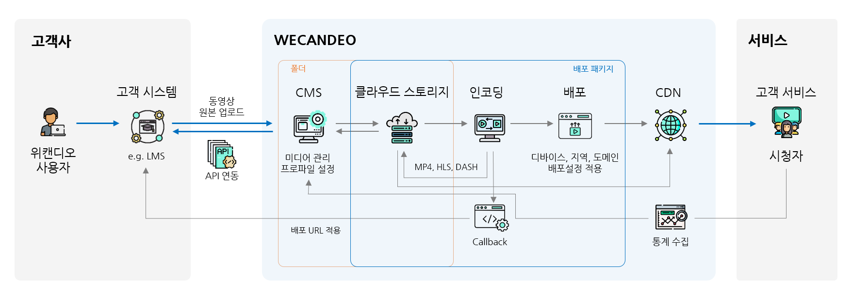 배포 소스 : 고객의 서비스에 동영상을 노출하기 위해 제공되는 콘텐츠 정보로 Embed Code와 URL로 제공됩니다. 위캔디오 플레이어를 사용하는 경우에는